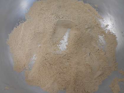 (上)小麦粉を弱火でふるって、褐色になるまでからいりしています。