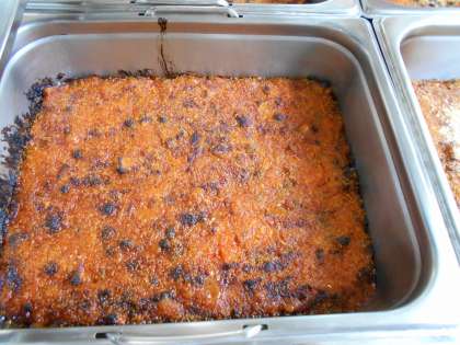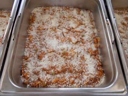 (中)にんにくをかおりよくいため、牛ひき肉、豚挽き肉をいためワインをかけ、さらに玉ねぎ、グリンピース、じゃがいもを加えていため水、塩、こしょう、ケチャップ、トマトピューレ、ウスターソースで味付けし、小麦粉を入れ、パン粉を振っています。