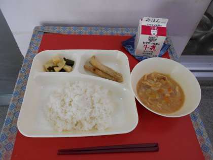 ★5月22日(水)の給食は、  ・きびなごのてんぷら  ・豚汁  ・わかたけ煮  ・ごはん  ・牛乳です。