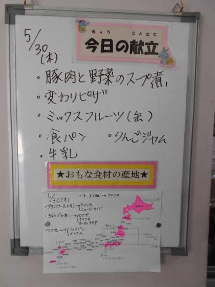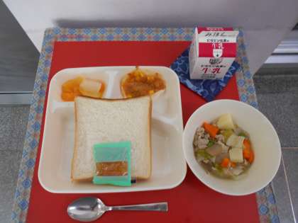★5月30日(木)の給食は、  ・豚肉と野菜のスープ煮  ・変わりピザ  ・ミックスフルーツ(缶)  ・食パン  ・りんごジャム  ・牛乳です。