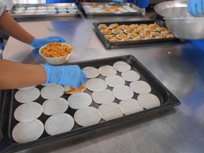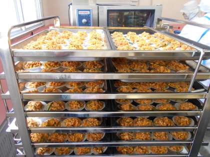 (中)変わりピザをのせたホテルパンをカートにのせています。一枚のホテルパンに24枚のピザがのります。このカートには、ホテルパンが20枚のります。