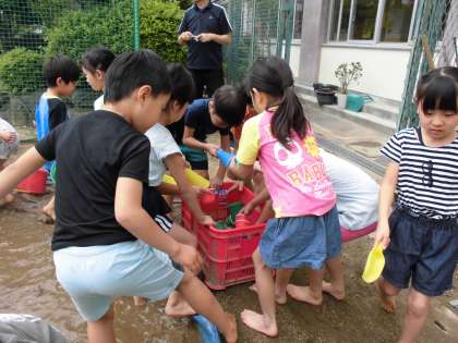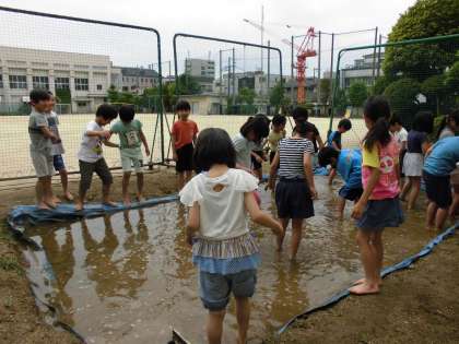 先週、一年生が学校の田んぼで泥遊びをしました。