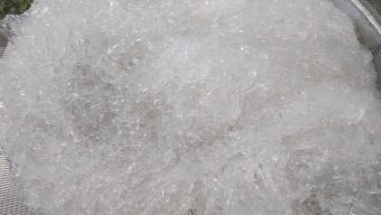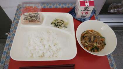 給食で使われている「はるさめ」は、さつまいもやじゃがいものでんぷんから作られています。緑豆から作られる中国の「緑豆はるさめ」にくらべて、太く、もちもちとした食感です。