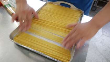 調理する前に、給食調理員さんたちが、スパゲティを袋からだして異物が混入していないかチェックしています。みんなに安心して給食を食べてもらうために、すべての食材をこうして検品しています。
