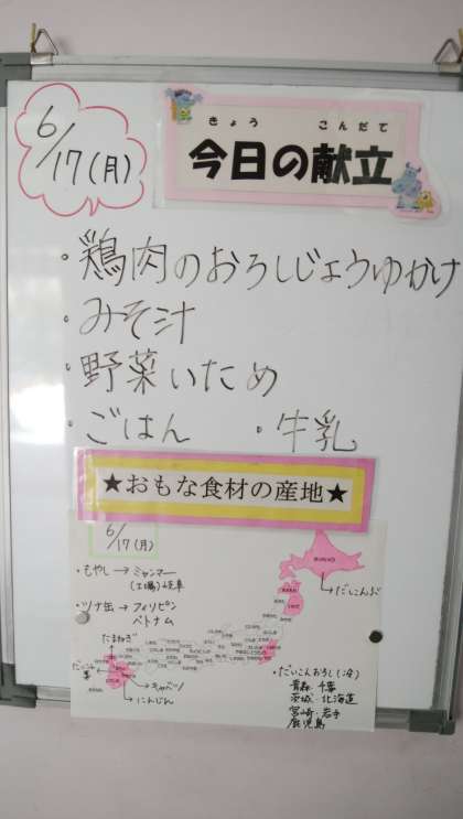 ★6月17日(月)の給食は、 ・鶏肉のおろしじょうゆかけ