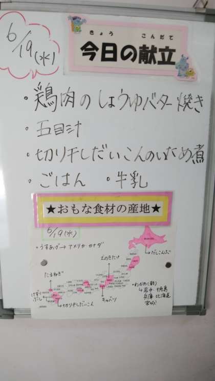 ★6月19日(水)の給食は、 ・鶏肉のしょうゆバター焼き