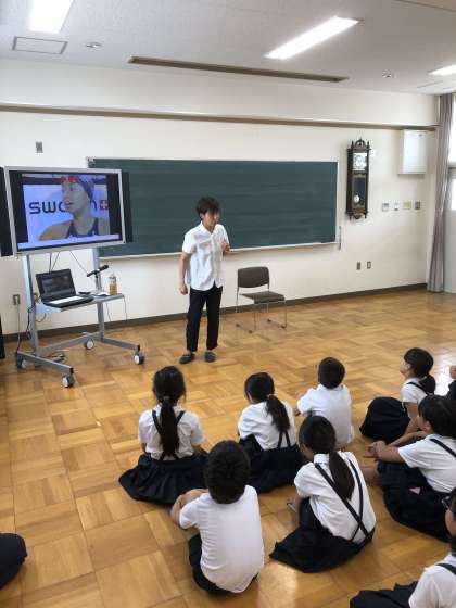 今日は、競泳元オリンピック代表の中西悠子さんにお越し頂き、4年生対象に「夢授業W」を行っていただきました。幼少期から選手時代を通しての経験や学ばれたことを教えて頂きました。(講演中にはアテネオリンピックで獲得された銅メダルを全員手に取らせていただきました!)また引き続き、プールでの実技指導も行っていただきました。