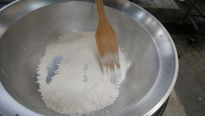 (中)「かぼちゃのミートグラタン」に使用する小麦粉を弱火で褐色になるまでからいりしている所です。