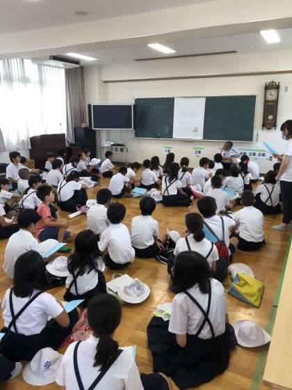 明日からの林間学習に備えて、今日は5年生が多目的室に集まりました。プログラムの確認や歌の練習をしました。
