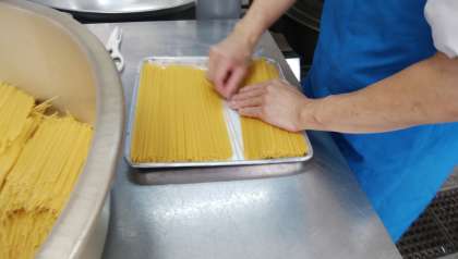※調理員さんたちが、ゆでる前のスパゲッティを1本1本異常がないか検品しています。