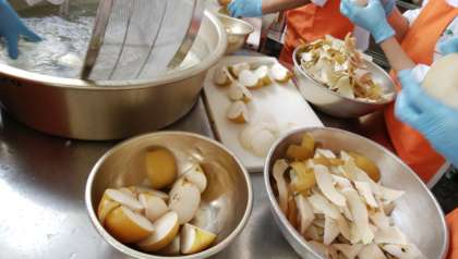 ※調理員さんたちが、なしの皮と芯をとってくれています。