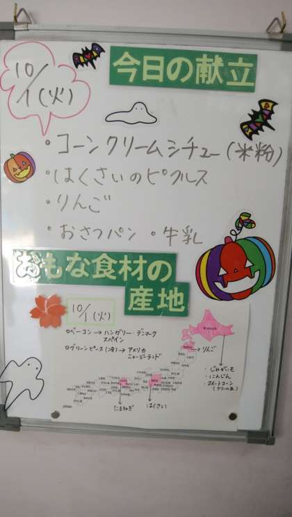 ★10月1日(火)の給食は、 ・コーンクリームシチュー(米粉)