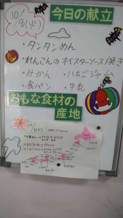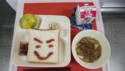 給食のタンタンめんは、チンゲンサイやもやし、にんじん、中華めんの入ったスープの上に、味付けしたひき肉をのせて食べます。