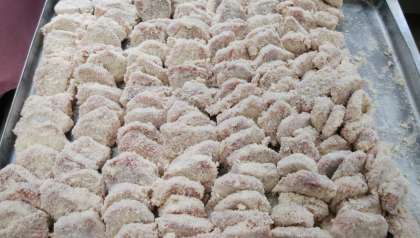 (中)小麦粉と水をまぜた衣とパン粉をつけます。