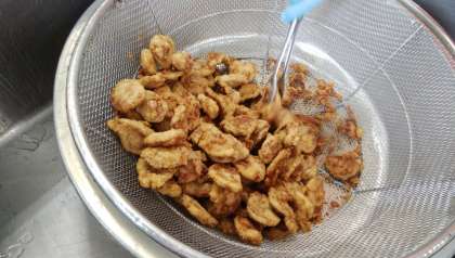 (下)きれいにあがりました。1人2個づつ数えて配缶です。八丁みそを使ったタレをかけていただきます。