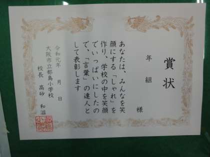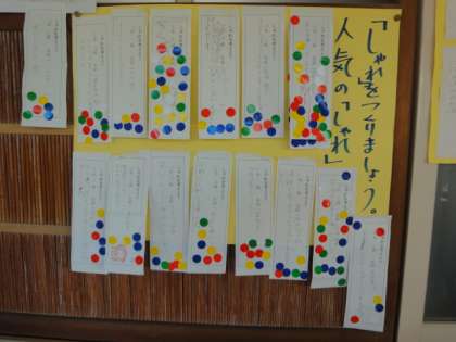たくさんの「しゃれ」ができました。友だちから支持された作品を、校長室の前に掲示しています。特に多く人を笑顔にした作品を作った児童に、11月11日の児童朝会で賞状を渡します。楽しみしてください。
