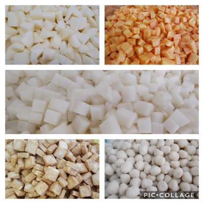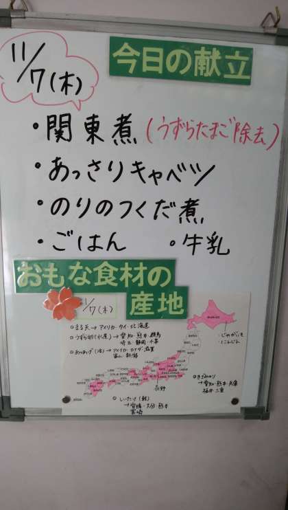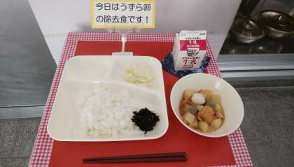 ★関東煮には、じゃがいも・にんじん・だいこん・鶏肉・あつあげ・まるてん(新製品です。)がはいっています。今日は、『うずらたまご』の除去食です。