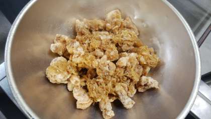 鶏肉に料理酒・しょうが汁で下味をつけ、でんぷんをまぶして油であげます。タレには、白ねぎ・砂糖・米酢・こいくちしょうゆ・湯・ごま油をあわせたものをあげた鶏肉にかけていただきました。