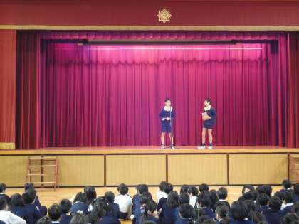 本日の児童集会では、地域の漫才大会に出場して優勝した六年生のコンビがみんなの前でネタを披露してくれました。
