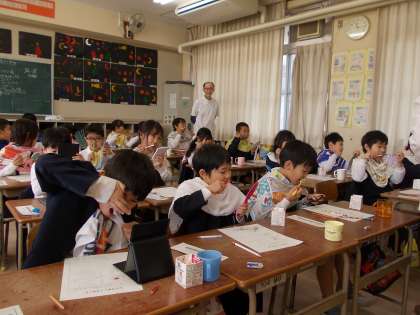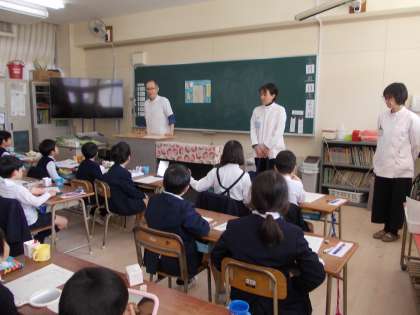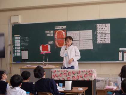 大阪市教育委員会から歯科衛生士さんと歯科校医の澤井先生に来ていただいて、2年生の歯みがき指導をおこないました。