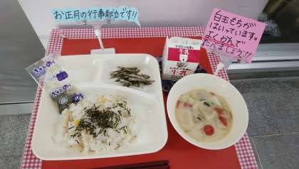 *今日の給食は、お正月の行事献立です。正月料理には、新年を祝う気持ちやいろいろな願いをこめたものがたくさんあります。