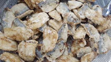 片栗粉をまぶしたアジを油であげて玉ねぎとレモンで作ったタレをかけています。児童に人気の献立ですs。