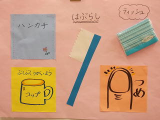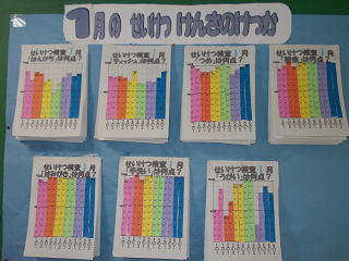 検査項目は、「ハンカチ・ティッシュ・爪・朝食・歯みがき・手洗い・うがい」の7項目です。検査の結果は、グラフにして保健室前の廊下に掲示しています。最近、ハンカチやティッシュを身につけていない人が保健室に来た時に聞いても増えています。風邪がはやる時期です。手洗いやうがいをしっかりするように呼び掛けていますので、手を洗ったあとにハンカチできちんと拭けるようよう、登校前に「ハンカチ・ティッシュ持っている?」とお声かけをお願いします。