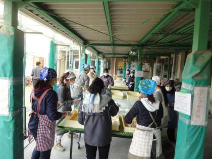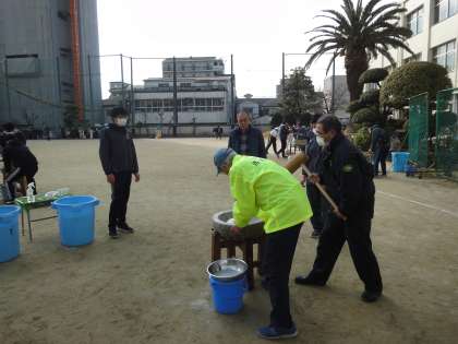 本日、本校校庭にてもちつき大会が行われました。地域や区役所、近隣校からも多数ご来場いただき盛況となりました。桜宮高校からのボランティア、都島工業高校の吹奏楽演奏など地域、PTAだけでなく多くの方々にご尽力頂きました。