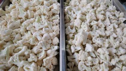 カリフラワーを焼き物機で蒸した後、砂糖・塩・米酢・うすくちしょうゆ・油をあわせたタレをかけていただきました。