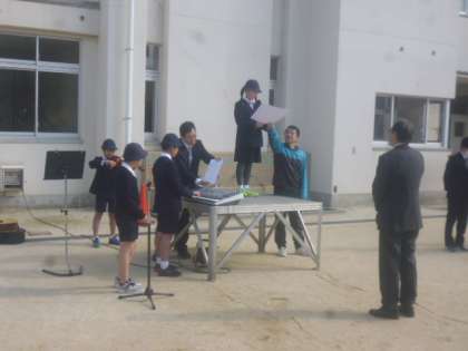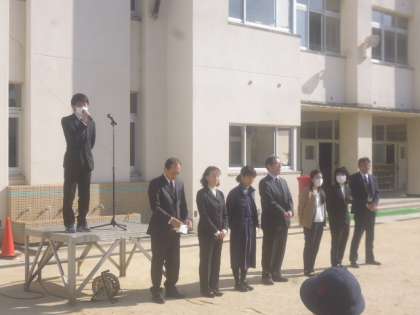 校長先生と生活指導の先生から話があり、その後、今年で転勤、退職される先生方の離任式がありました。