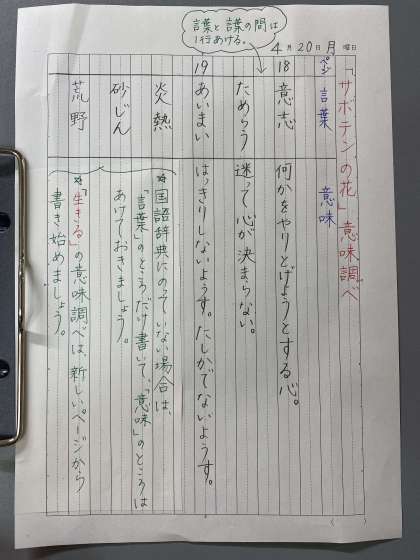 音読して分からなかった言葉を調べて、国語ノートに書く。