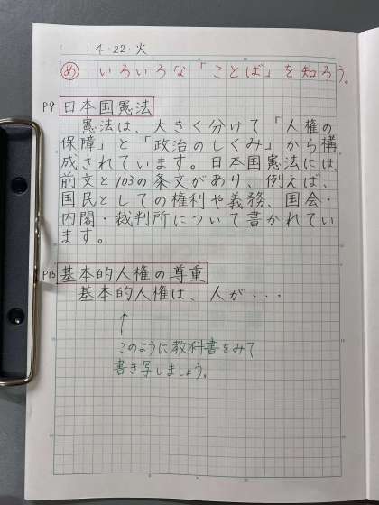 ◎社会の教科書(政治・国際編)の「ことば」(P.9、15、16、19、25、27、28、30)を社会のノートに書き写しましょう。