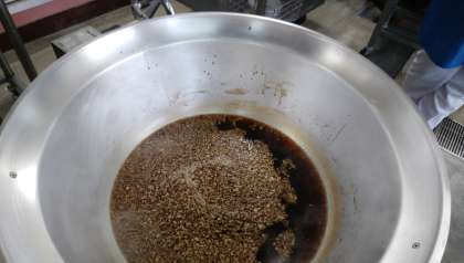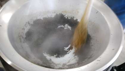 1…だし、しいたけのもどし汁に砂糖、料理酒、みりん、こいくちしょうゆをあわせて、そこに小さく切ったしいたけを加えて煮ます。
