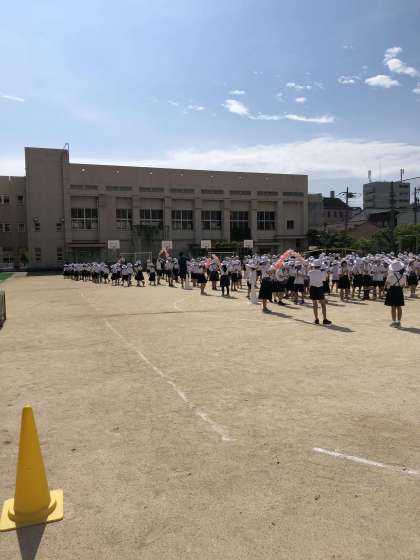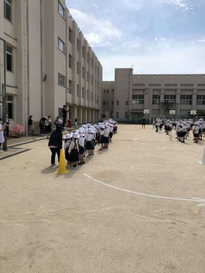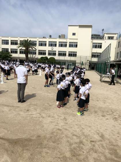 全員登校が始まって一週間が経った今日、初めて全校児童が揃っての集まりがありました。今学期はまだしばらく、全校児童朝会や集会は行えませんが、今日は、実施できなかった始業式や対面式、教職員の紹介のために特別に行われました。感染防止対策を行いつつ、できる限り通常の学校生活を送れるよう取り組んでいきます。