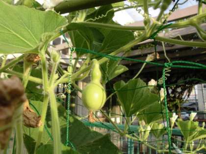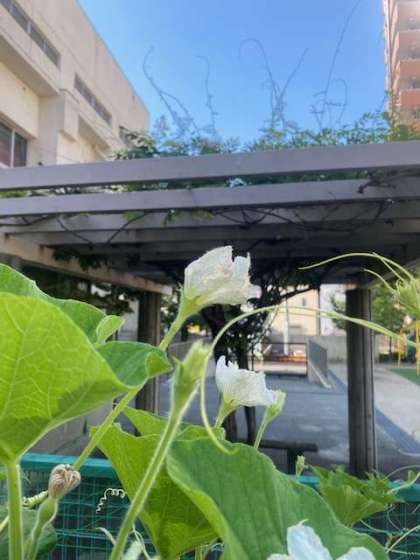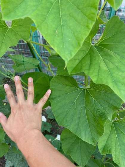 お花がきれいに咲いています。(写真右)め花から小さな実ができていました。(写真左)ヘチマと同様、葉の大きさは、大人の手の大きさを超えました。(写真中央)