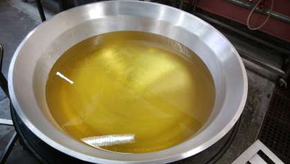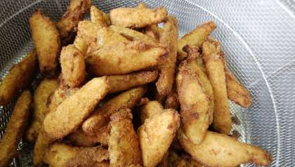 油専用の大きな釜で冷凍のサーモンフライを揚げています。