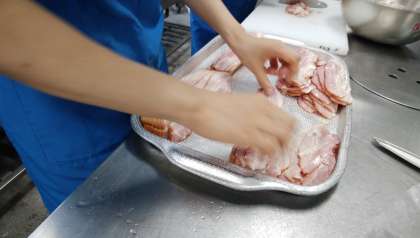 豆乳スープで使用するベーコンを調理員さんが1枚1枚検品してくれています。