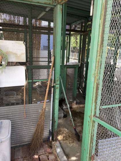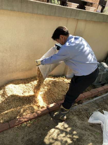 本校にはウサギ小屋があり、飼育委員会でお世話をしています。毎年2回、地域エコクラブよりおがくずをご提供頂き、小屋に敷き詰めたおがくずを入れ替えています。古くなったおがくずは廃棄せず、エコクラブの「たいひ(堆肥)研究所」で熟成され、また肥料として再利用されています。