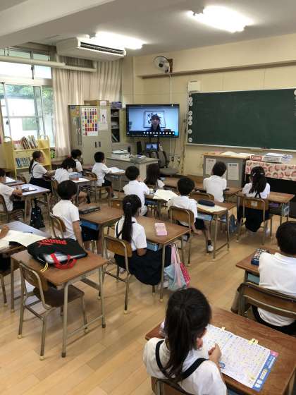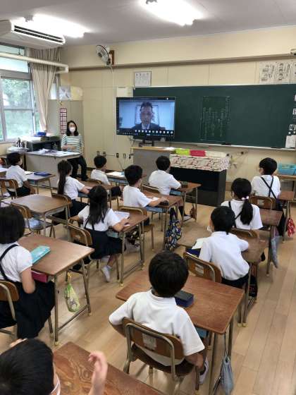 今日の朝会は本校でも準備が進みつつある双方向通信“Teams"を使って、校長室と各教室をつないで行われました。