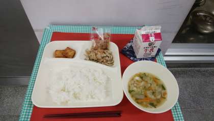 給食では、薄く切ったにがうりに塩で下味をつけた後、豚肉ともやしといためています。塩、こいくちしょうゆで味付けし、かつおぶし(袋)をかけていただきました。