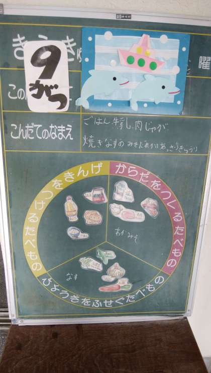 給食終了後、その日の給食委員さんが給食室前の黒板に、次の日のメニューと各食材のふだを「エネルギーのもとになる」「からだをつくる」「体の調子をととのえる」に分けてはってくれています。