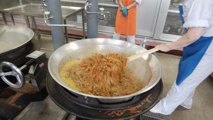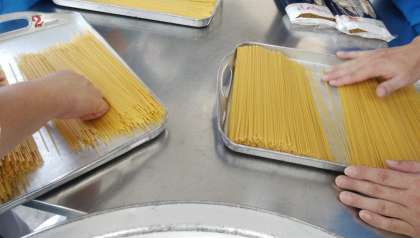 *スパゲティはゆでる前に、調理員さんたちがめんに異物がついていないかを検品してくれています。