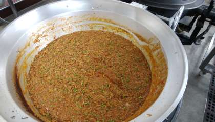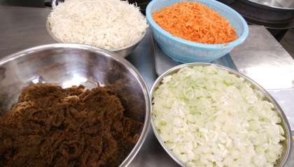 メキシコ料理のタコスの具をごはんにのせた沖縄県で人気の料理です。牛ひき肉、豚ひき肉、玉ねぎ、グリーンピースを炒め、味付けし、ごはんにかけて食べます。