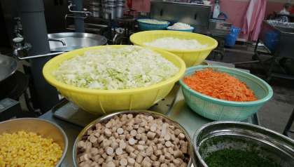 今日のスープには、豚肉・ウインナー(カット)・たまねぎ・にんじん・キャベツ・コーン(冷)・パセリがはいっています。