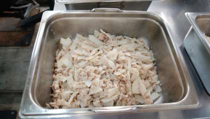 ・ミニバットにツナ、じゃがいも、塩とこしょうで味をつけた卵にとかしたバターをかけて焼き物機で焼きました。