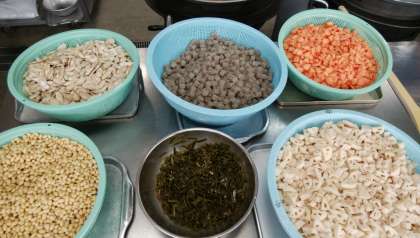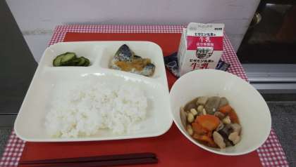 *今日の煮物には、鶏肉・こんにゃく・大豆煮・れんこん・ごぼう・にんじん・切りこんぶがはいっていました。
