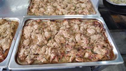 鶏肉とたまねぎ、ピーマンにねりごま、砂糖、みりん、こいくちしょうゆで下味をつけ、いりごまをかけて焼き物機で焼きました。