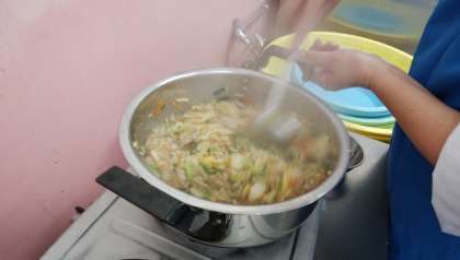 今日の中華丼は、『うずら卵』の除去対応献立でした。うずら卵アレルギーの児童にはうずら卵を中華丼に入れる前に、別のお鍋にとってピンク色の食器に配缶しています。