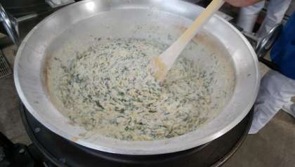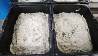 ・ミニバットにいれて粉チーズ、パン粉をかけて焼き物機にいれます。