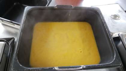 ういろうは、米粉、砂糖などを混ぜてむして作ります。生地にまっ茶やかぼちゃをまぜたもの、上に小豆をのせた「水無月(みなづき)」など、さまざまなものがあります。今日の給食には、かぼちゃを混ぜた「かぼちゃういろう」が出ます。
